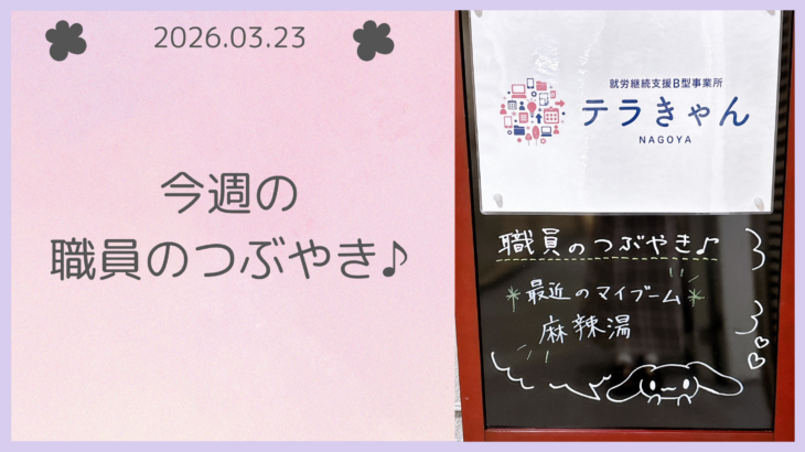 こんにちは!就労継続支援B型事業所テラきゃん運営スタッフHです(*’ω’*) あっという間に3月ですね!最近ようやくあたたかくなってきて嬉しいです(n*´ω`*n)さて、今週の職員のつぶやきはこち […]