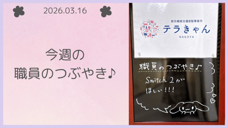 こんにちは!就労継続支援B型事業所テラきゃん運営スタッフHです(*’ω’*) 今週の職員のつぶやき、ついに20回目になりましたね!すごい!!!(自画自賛)これからもゆるゆると続けていきます٩( & […]